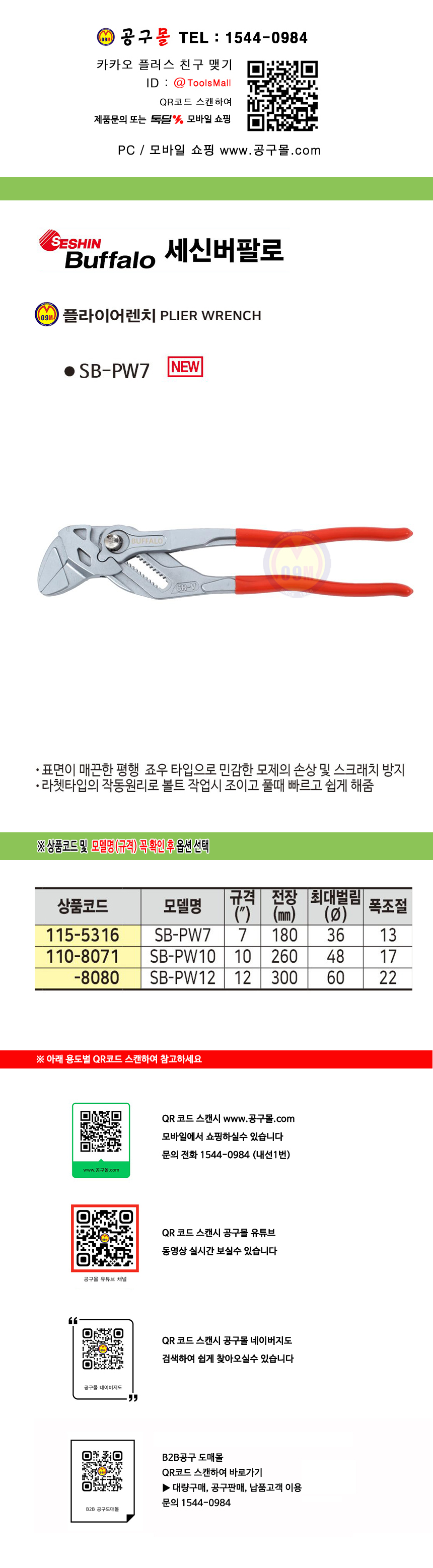 세신 플라이어렌치 SB-PW7, PW10, PW12 SESHIN 버팔로 첼라, 울산공구몰 110-8071