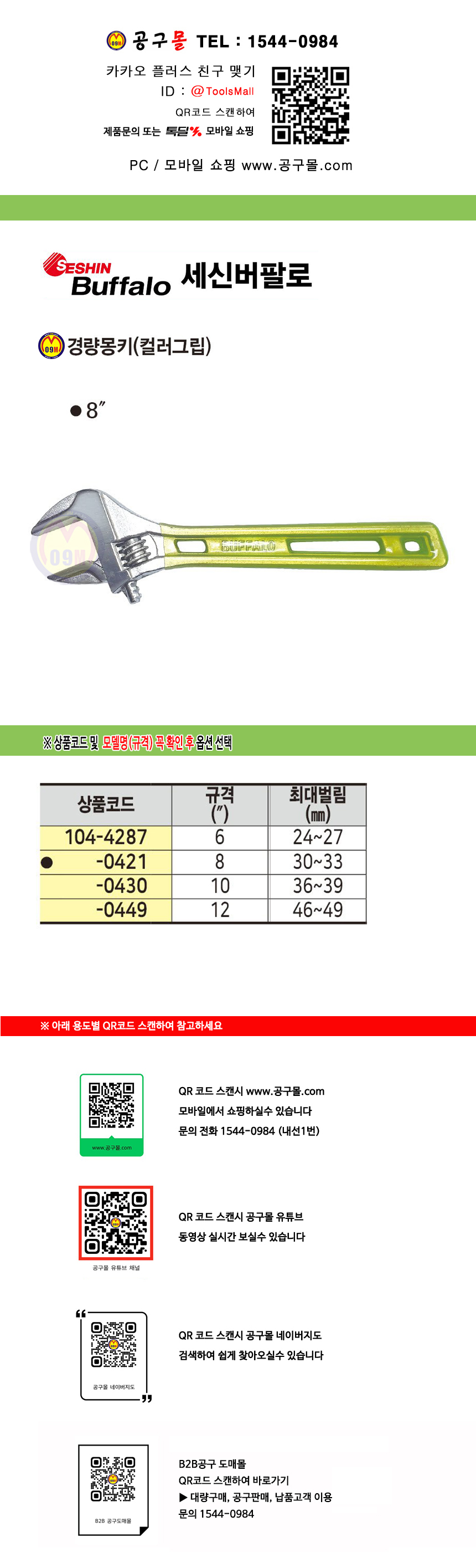 세신 경량몽키(컬러그립) 150mm (6)/ 300mm (12)/ 몽키스패너, SESHIN BUFFALO, 세신공구, 버팔로 공구몰 104-0430