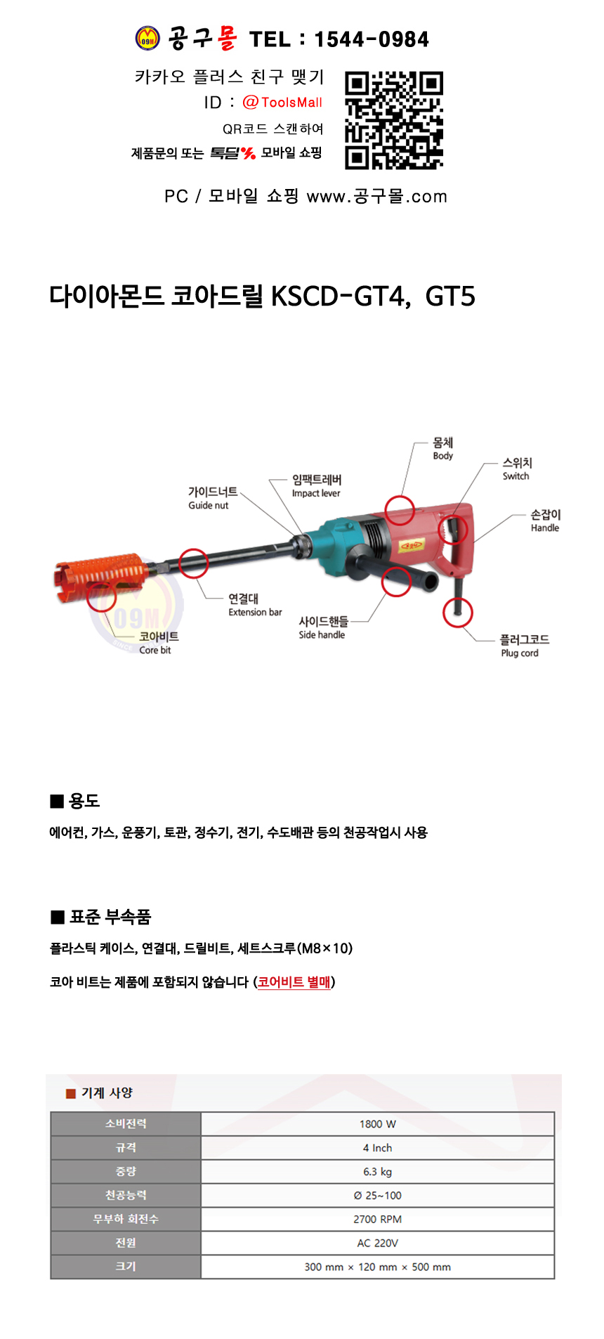 공성 건식 코아드릴 KSCD-GT4, GT5 AC220C-1800W KONGSUNG 공구몰 KSCDGT4