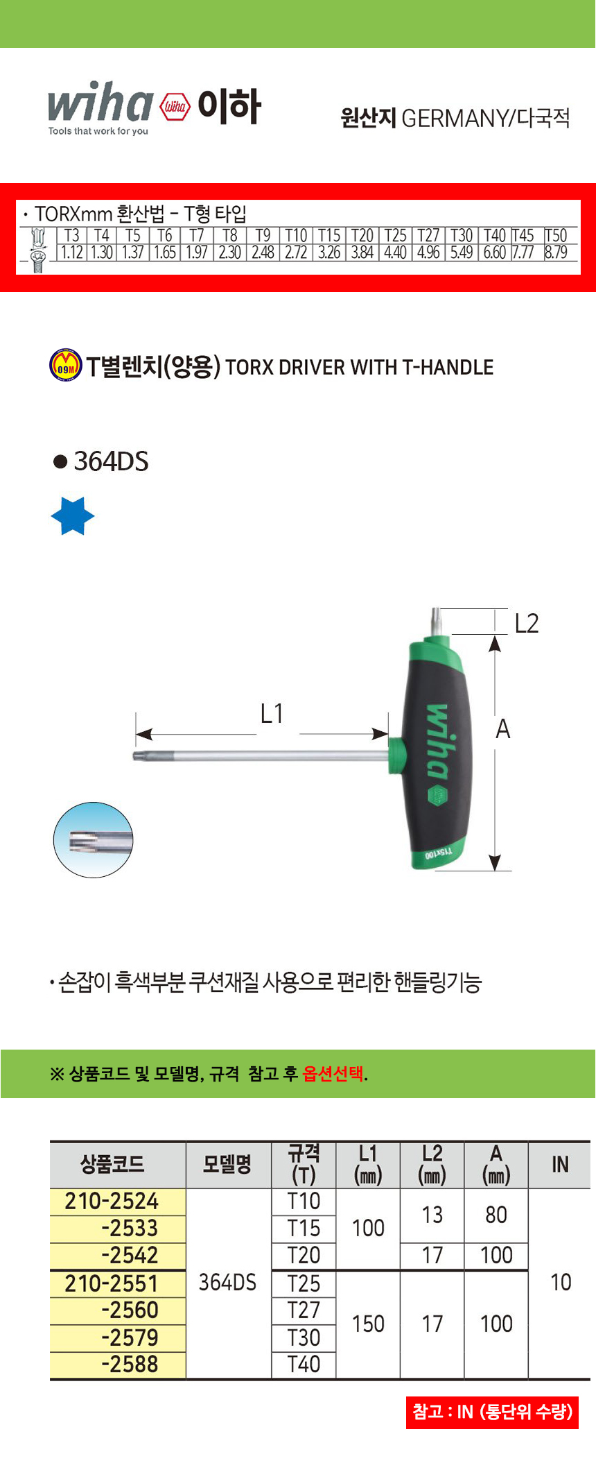 이하 T별렌치 (364/ 롱) T45-T50 (전장250mm) wiha 별드라이버렌치 공구몰 210-2418