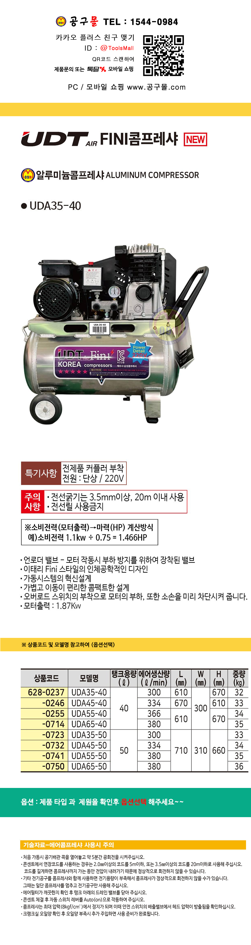 UDT 알루미늄콤프레샤 UDA35-40/ UDA65-50, 32Kg-36Kg 이동용콤프레샤, 공구몰 628-0237