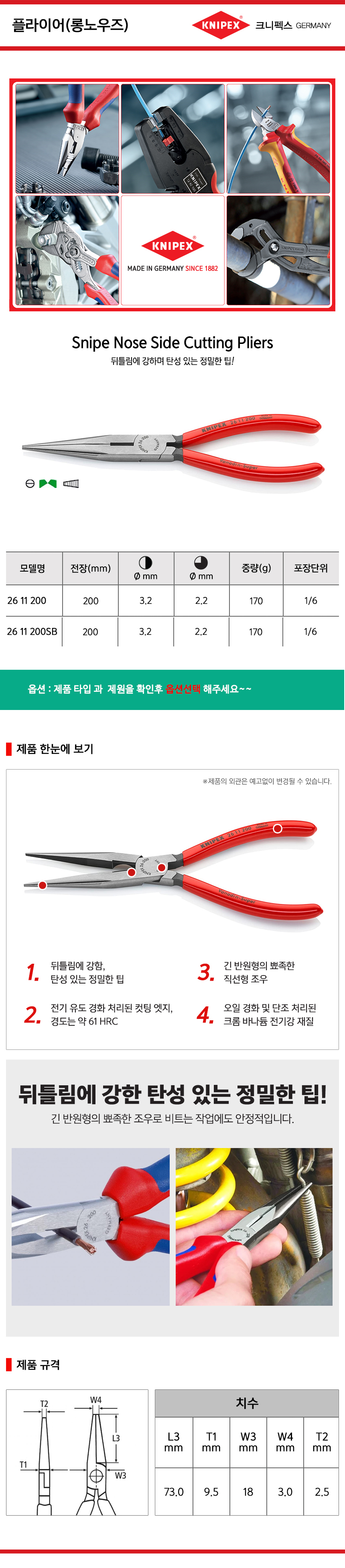 크니펙스 플라이어(롱노우즈,절연) 26-26-200, 26-26-200SB KNIPEX 독일공구 공구몰 101001020098