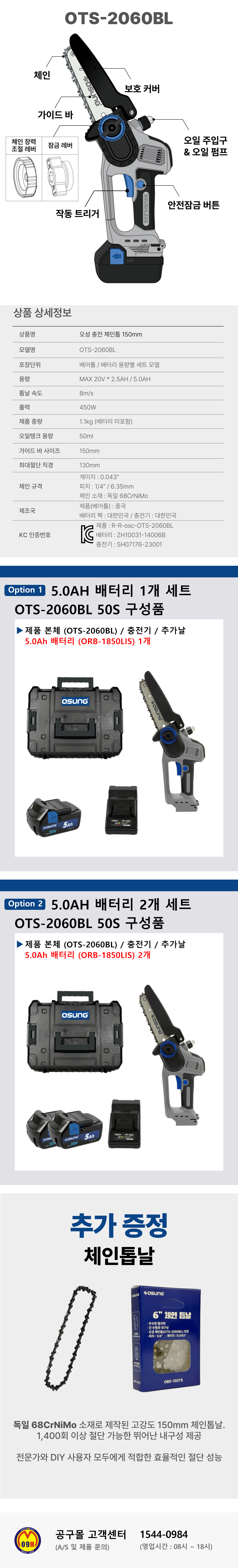 오성 20V 충전체인톱 OTS2060BL (20V-5.0AH-150mm) 미니체인톱 가지용