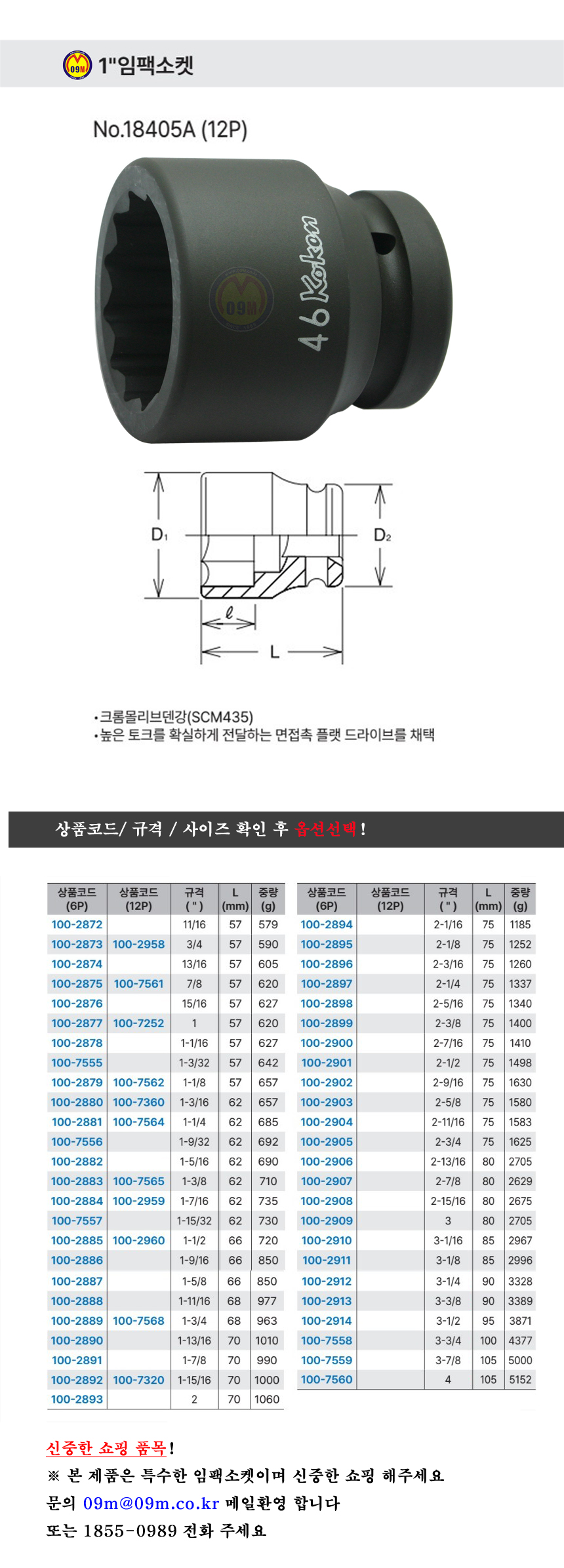 코켄 임팩소켓 18405A 12P 1inchx(11/16, 1-3/4inch) KOKEN, 대형소켓 100-7360