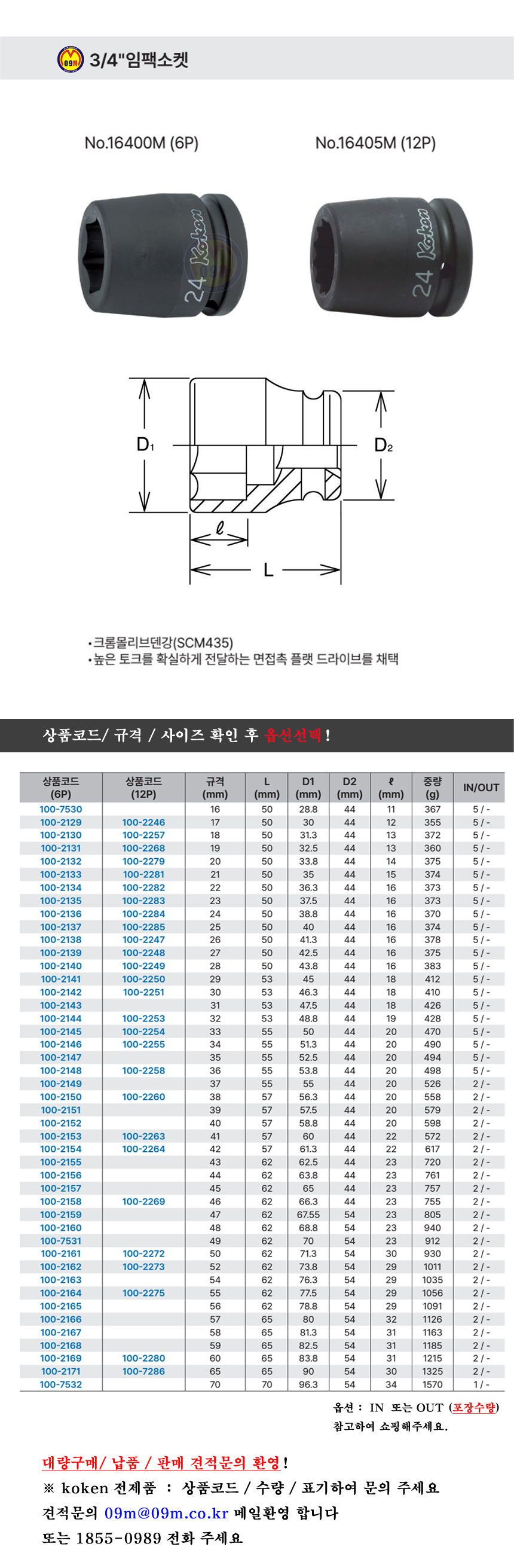 코켄 임팩소켓 16400M 16405M 3/4(16-38mm) 6P/12P KOKEN, 임팩복스알 100-7530