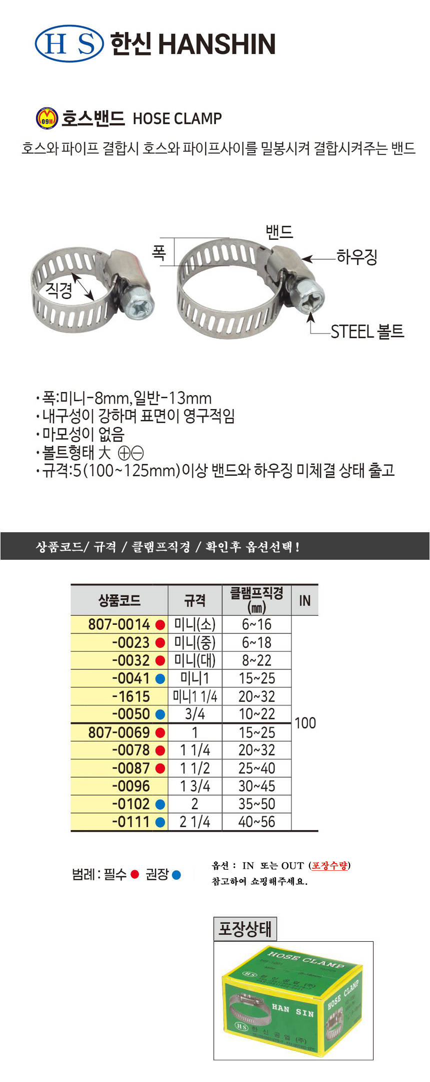 한신 호스밴드(SUS304) 5 (100-125mm), 7 (150-175mm) 규격선택 볼트형태