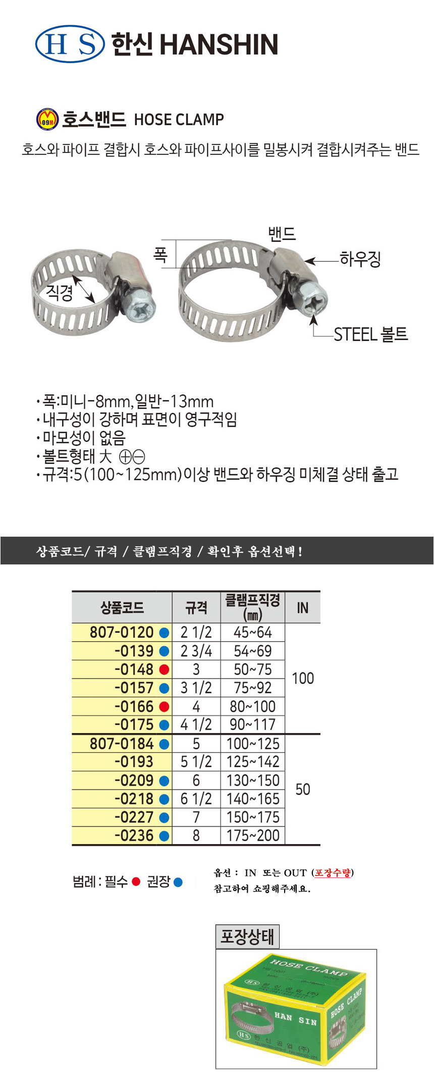 한신 호스밴드(SUS304) 5 (100-125mm), 7 (150-175mm) 규격선택 볼트형태